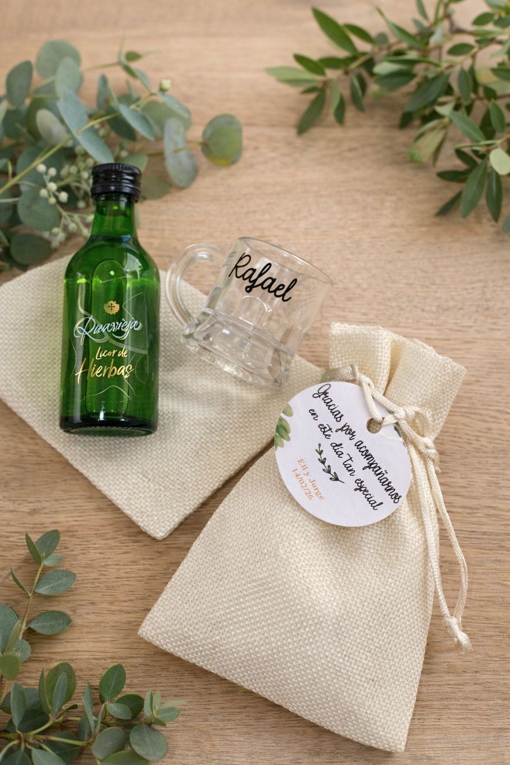 Cada pack incluye un mini vaso de chupito vinilado con el nombre de cada invitado, una mini botella de licor de orujo artesanal Hiberas y una bolsita de algodón natural. Todo va presentado con una etiqueta colgante personalizada con los nombres de los novios, creando un detalle único y especial.