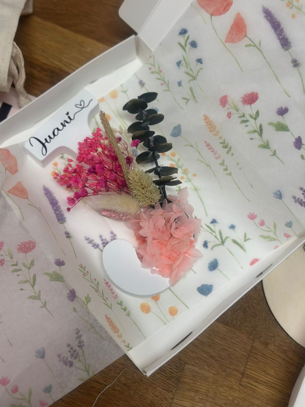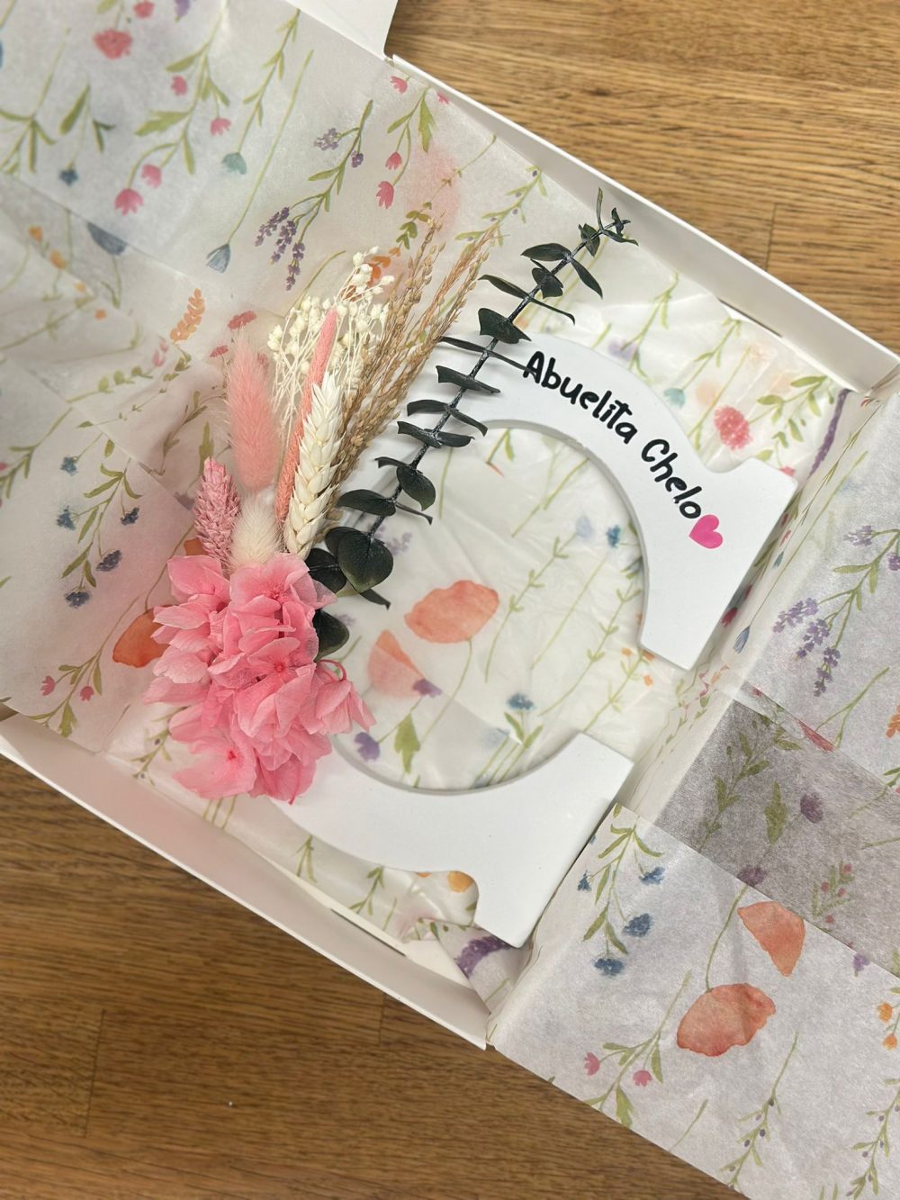 La inicial flores preservadas puede personalizarse eligiendo la letra, el color dominante. El resultado es un detalle artesanal que combina elegancia, naturaleza y significado en una sola pieza.