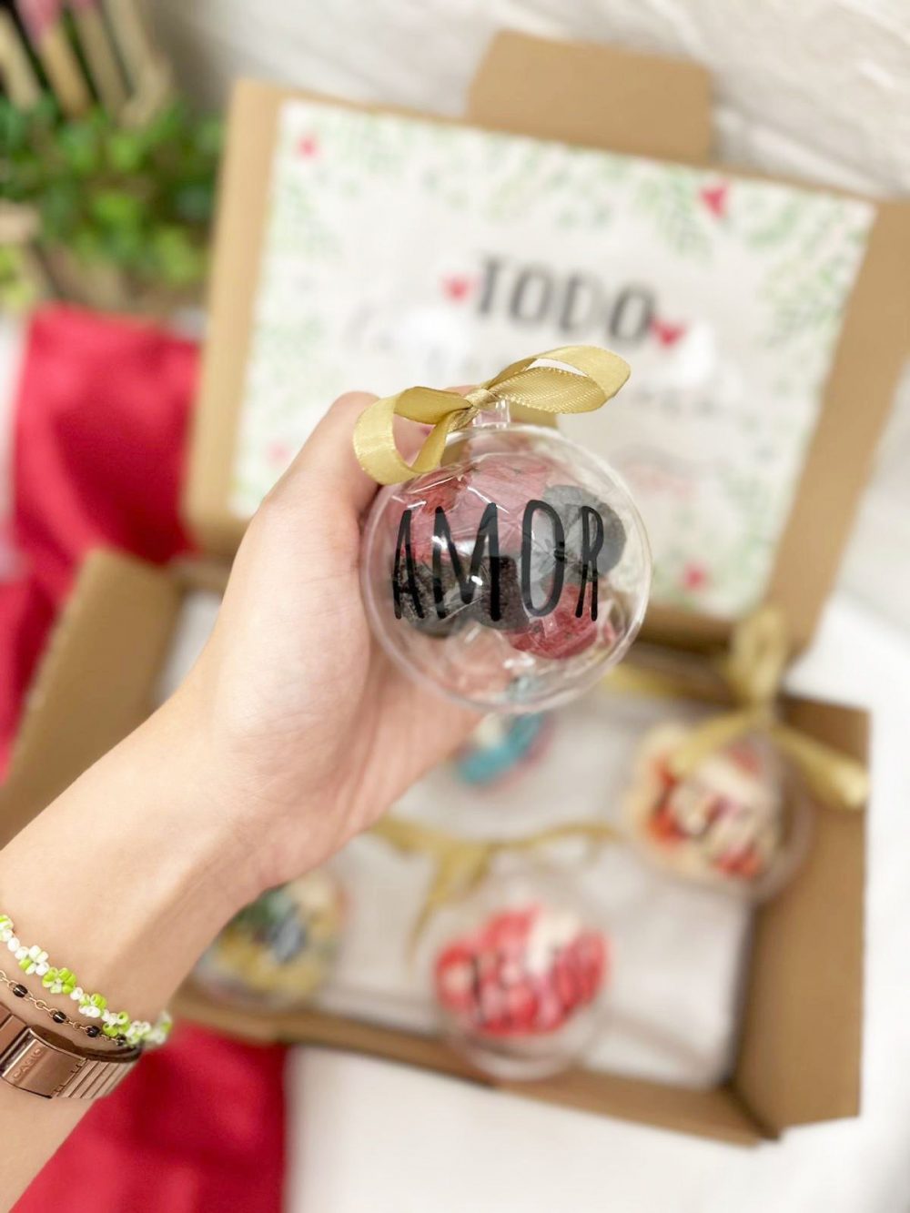 Estas bolas de Navidad personalizadas no solo son un detalle dulce, sino también decorativo. Puedes colgarlas del árbol de Navidad o colocarlas dentro de la caja como un regalo sorpresa. Cada bola representa un mensaje especial, haciendo que la experiencia de abrirlas sea única y llena de emoción.