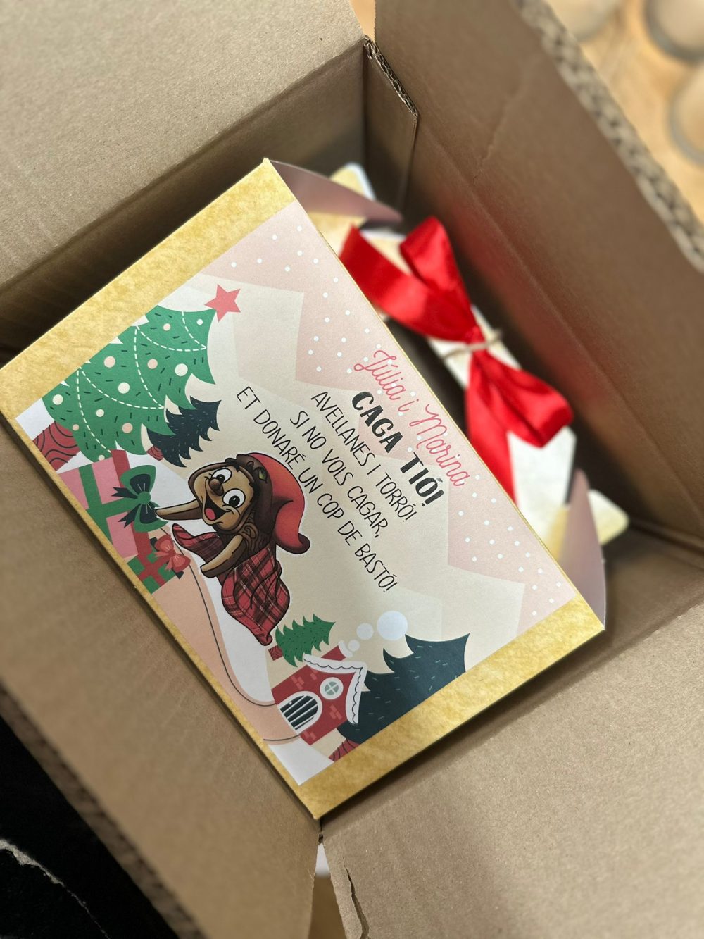 Celebra la Navidad de una forma mágica y divertida con nuestro kit Caga Tió personalizado, un regalo lleno de ilusión que encantará a los más pequeños de la casa. Este kit incluye un peluche del Caga Tió con el nombre del niño, una botella de chuches variada y una caja decorada y personalizada con detalles navideños. Todo preparado con mucho mimo para que cada niño viva la tradición del Tió de Nadal de manera especial.