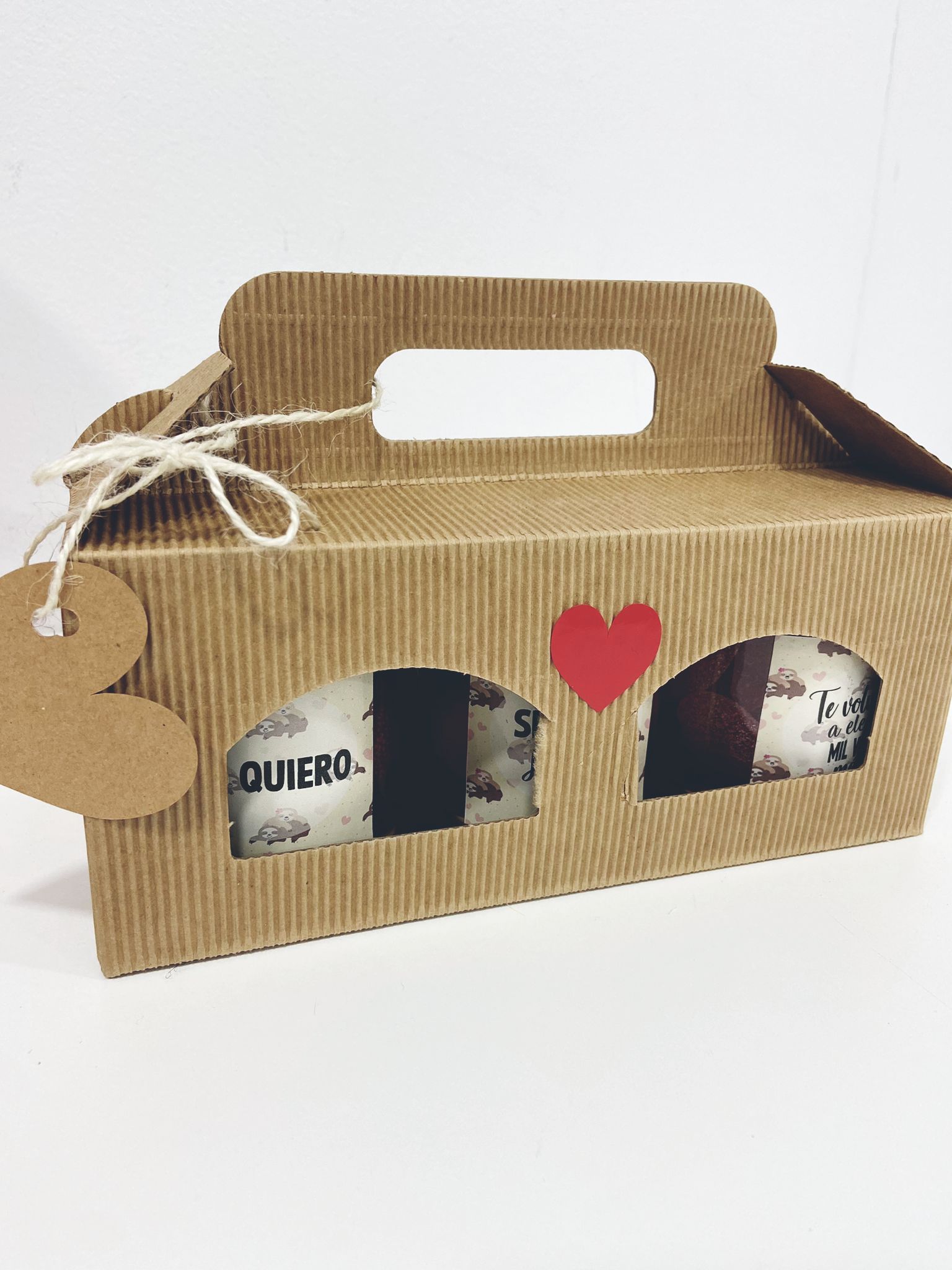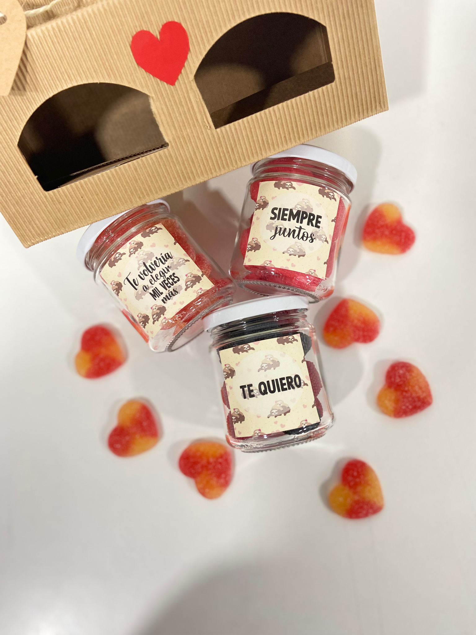 Un mensaje claro y directo que convierte este kit de chuches para parejas en un regalo cargado de sentimiento. Los tarritos vienen presentados dentro de una elegante caja kraft, resistente y cuidada, lista para regalar, sin necesidad de envolver.