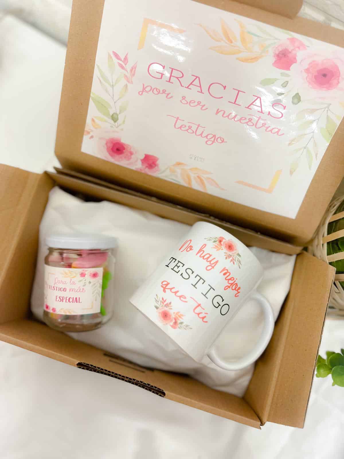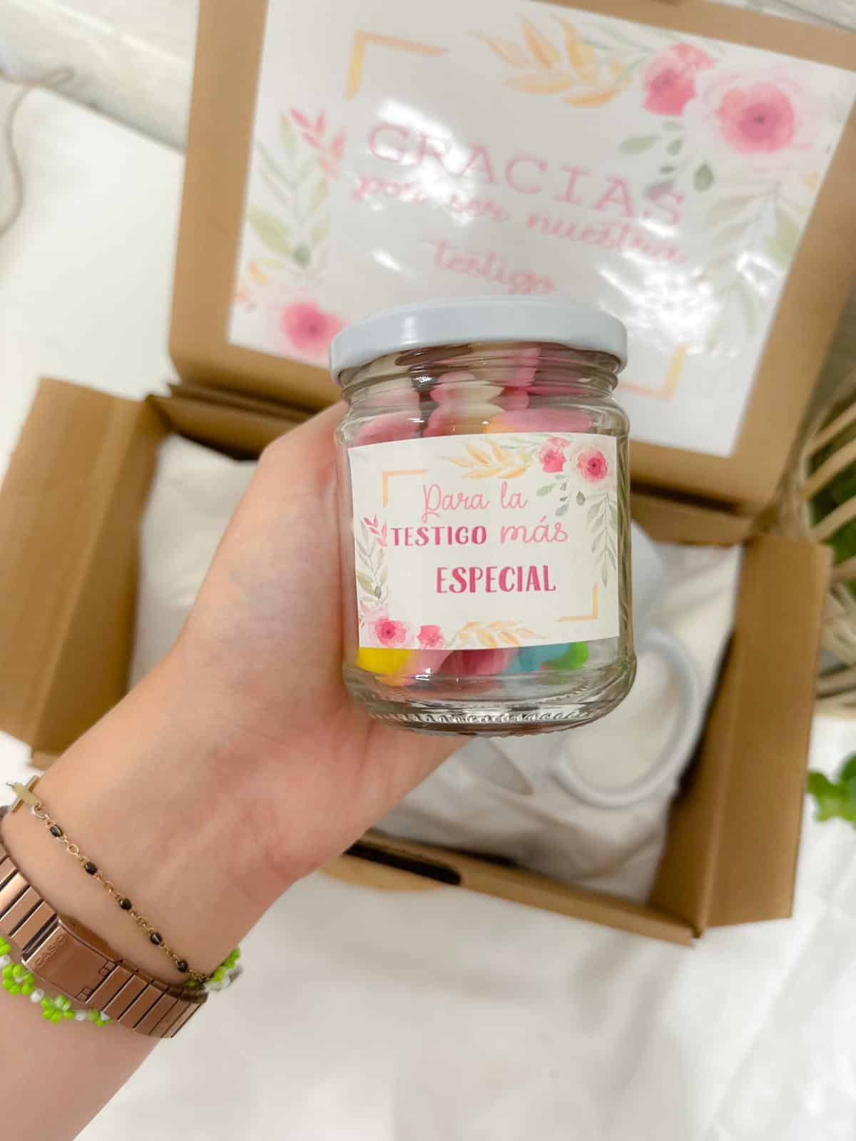 Este pack gracias por ser mi testigo incluye una taza personalizada con la frase “gracias por ser mi testigo”, ideal para que recuerde siempre ese momento tan importante. Junto a ella, un tarrito de chuches que aporta dulzura y diversión al regalo. Además, de manera opcional, puedes añadir un pequeño arreglo floral en la taza, transformándola en un centro decorativo único que dará un aire aún más especial al obsequio.