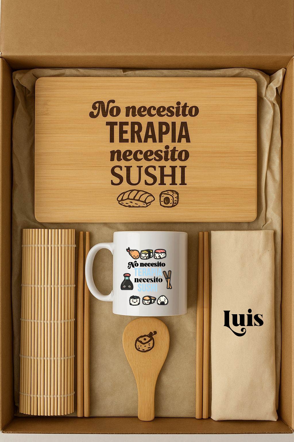 Sorprende a los amantes de la gastronomía japonesa con un regalo original, elegante y lleno de significado. Nuestro kit sushi personalizado es la elección perfecta para quienes disfrutan preparando y compartiendo sushi en casa. Ideal para regalos de Navidad, cumpleaños o cualquier ocasión especial, este set combina funcionalidad, diseño y un toque único de personalización.