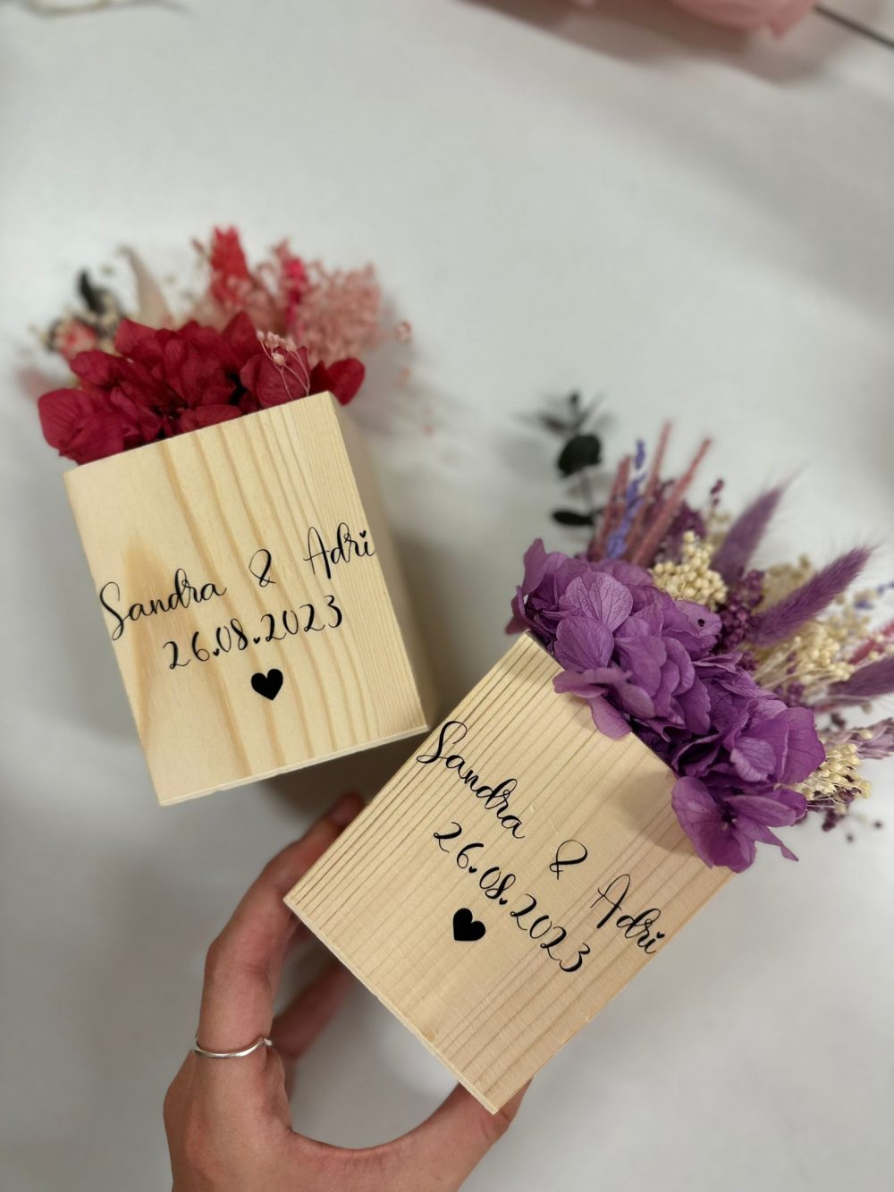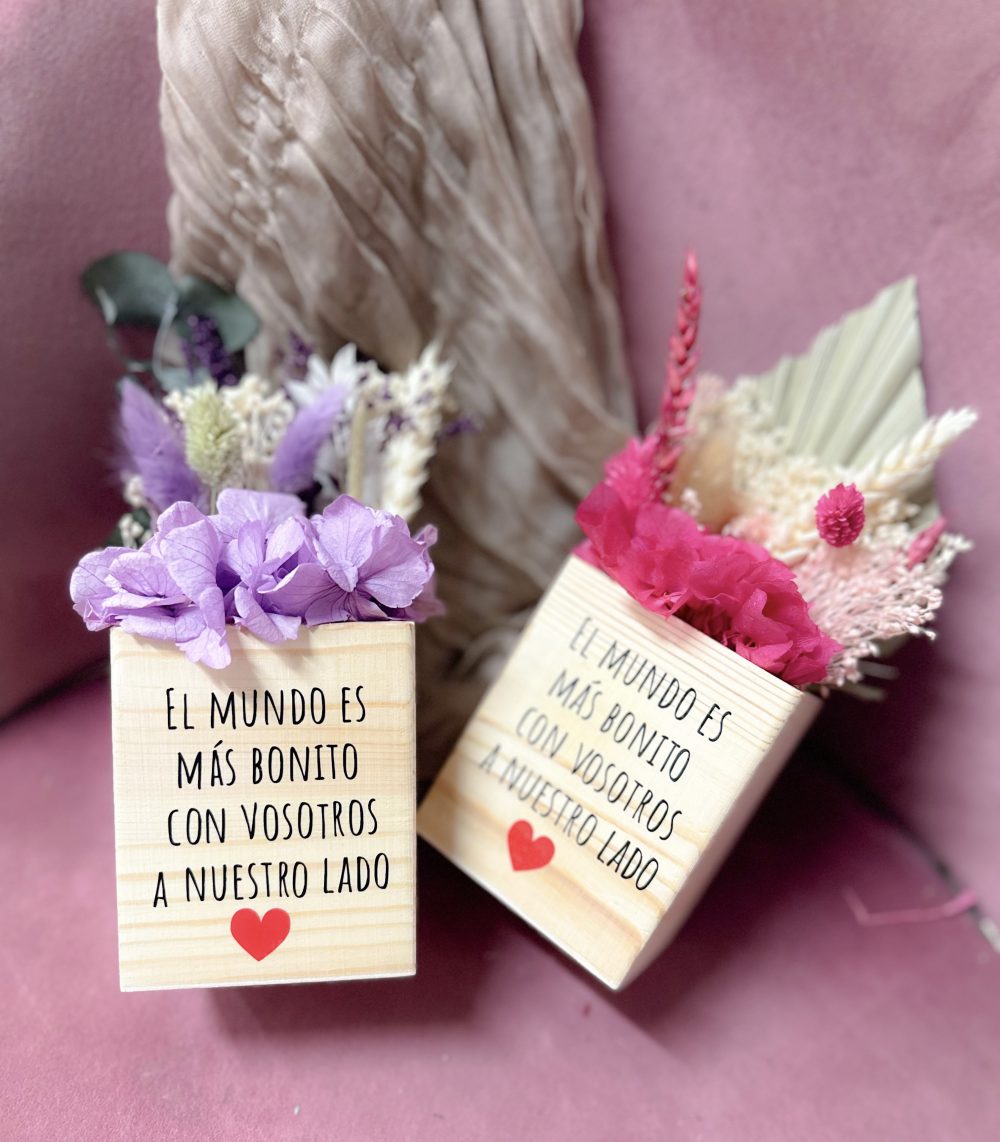 Cada pieza incluye una base de madera natural grabada con el mensaje que tú elijas, haciendo de este detalle algo completamente personal y especial.