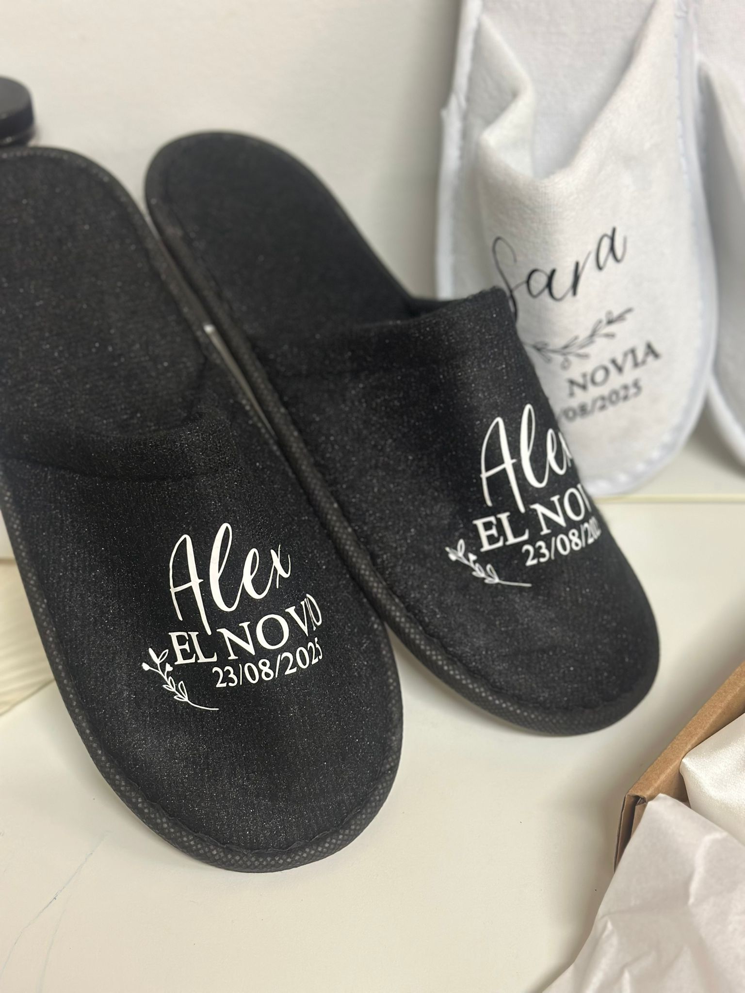 En nuestra tienda, tenemos una selección perfecta de accesorios personalizados para el novio. Descubre zapatillas, batas y perchas personalizadas que combinarán estilo y comodidad para hacer de su día aún más memorable. Con nuestros productos exclusivos, cada detalle del gran día será único y especial.