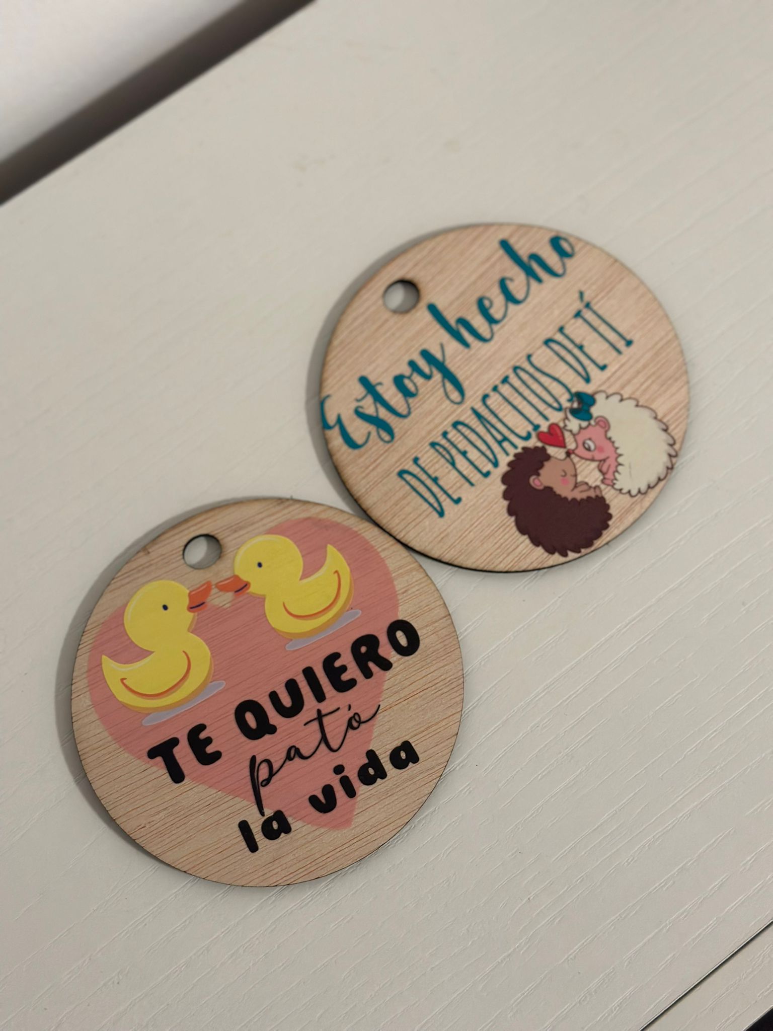 - Placa de madera personalizada: Este ramo incluye una placa de 10×10 cm grabada a todo color con un mensaje a tu elección. Entre los diseños disponibles, puedes elegir: