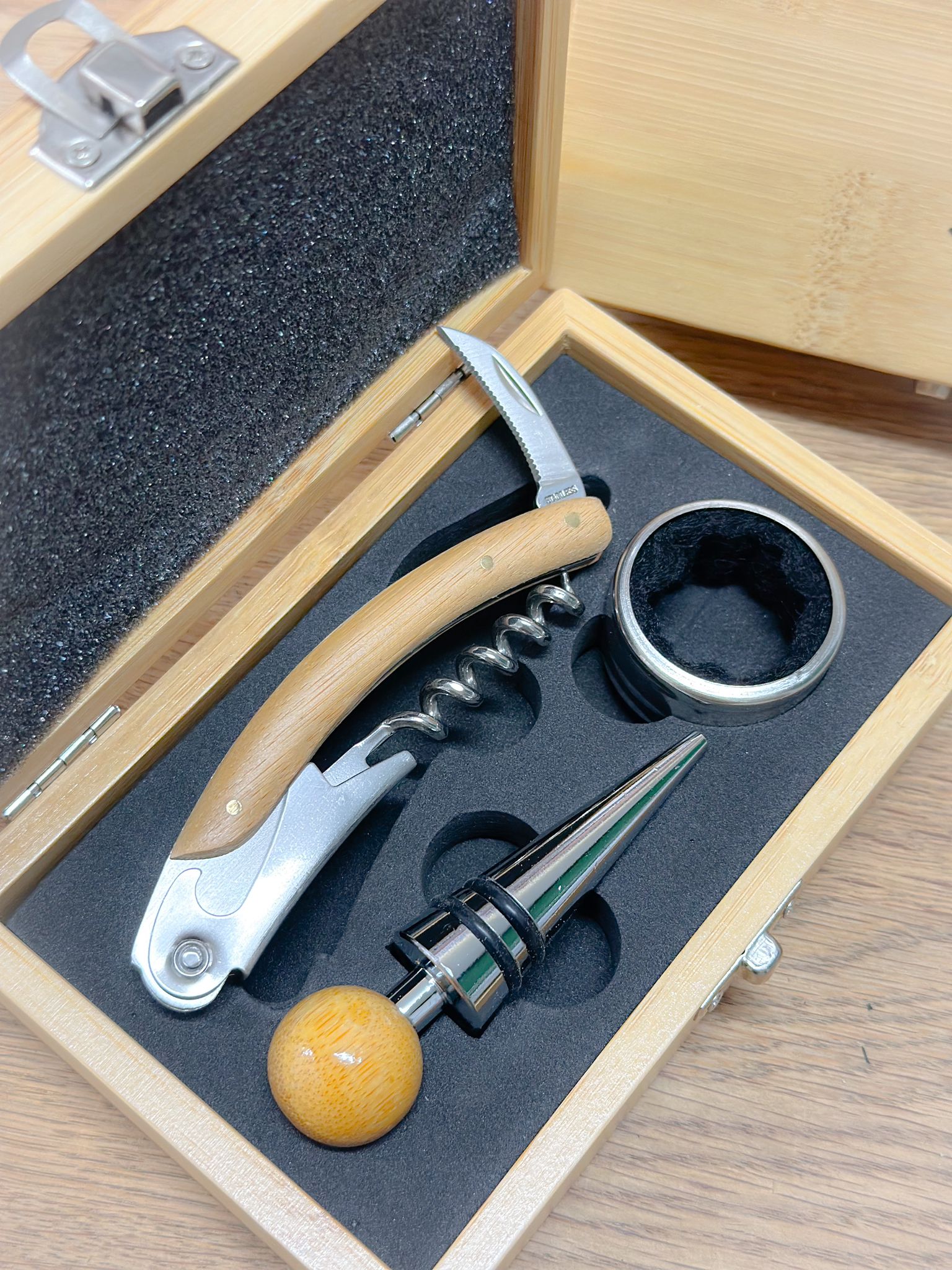 Este set de vino premium madera es el regalo ideal para los apasionados del vino. Con un diseño elegante y sofisticado, incluye todo lo necesario para disfrutar de una cata excepcional. Perfecto para cualquier ocasión, desde bodas hasta celebraciones especiales.