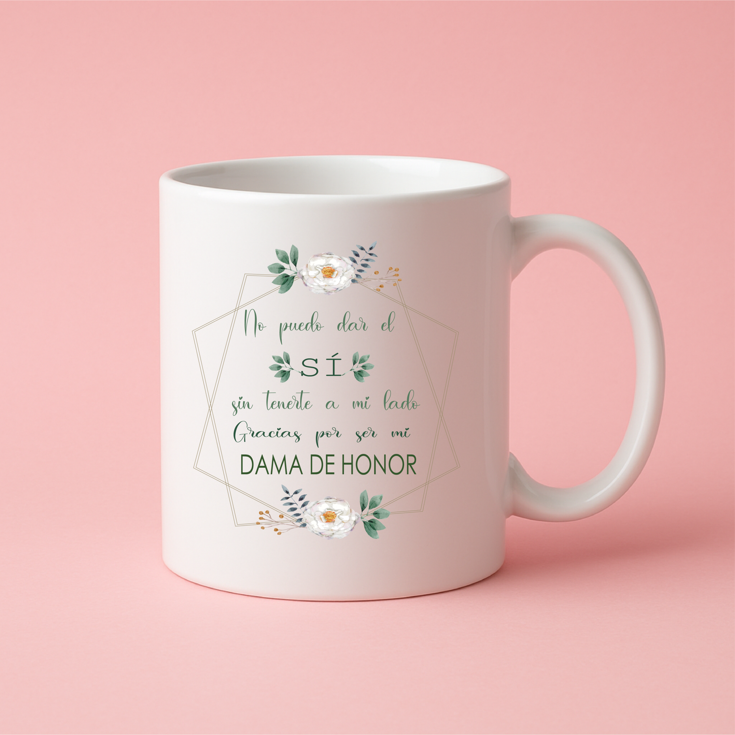 - Mensaje Significativo: La taza presenta el mensaje «¿Quieres ser mi Dama de Honor?» impreso de manera elegante y llamativa.